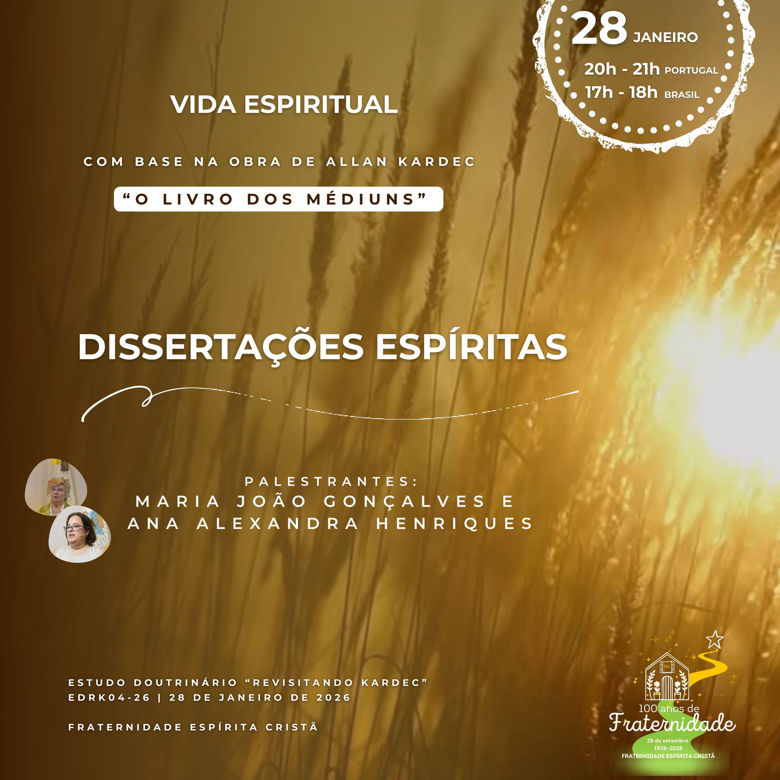 DESDE 1928 a estudar a doutrina espírita e a iluminar consciências inscreva-se 95.º Aniversário da FEC Estudo Doutrinário 2025/2026 Ciclo de Palestras "Revisitando Kardec" Dia 28 de janeiro, 4.ª feira, 20h às 21h Pode assistir presencialmente na FEC ou através do nosso canal de Youtube e página de Facebook Contamos com a sua presença! Assista à palestra aqui! 95.º Aniversário da FEC Fraternidade Espírita Cristã (FEC) O que é a FEC Um Centro Espírita Espaço de estudo e divulgação da Doutrina Espírita Promoção de programas de estudo, palestras, seminários, workshops e conferências Publicação trimestral do boletim A Libertação Serviços de assistência espiritual A FEC desenvolve igualmente atividades de auxílio ao próximo através da ação social, em parceria com a Associação Auxílio e Amizade, uma Instituição Particular de Solidariedade Social que assiste famílias materialmente desfavorecidas na zona de Lisboa. (auxilioeamizade.pt) O que fazemos Atividades Atendimento Fraterno É uma forma de auxílio personalizado, com alguém disponível para ouvir, confortar e esclarecer de acordo com a Doutrina Espírita. Estudos São propostas de estudo em grupo (turmas) de temas que conduzem à reflexão sobre a importância da melhoria moral. Palestras Palestras de estudo doutrinário realizadas por diferentes expositores, sobre temas da atualidade. Auxílio Espiritual A FEC conta com um conjunto de serviços de auxílio, que contribuem para o auxílio físico e espiritual. Estudos Espíritas Têm como objetivo favorecer o desenvolvimento da consciência espírita, necessário ao aprimoramento moral do ser humano. AdultosCrianças e juventudeAdultos Aperfeiçoar o conhecimento do Espiritismo, por meio de estudos, leituras, pesquisas, análises, correlações e reflexões de assuntos existentes nas obras espíritas de referência. Crianças e juventude A atividade de Evangelização Espírita Infanto Juvenil, abrange as aulas de evangelização espírita, momento especial de convivência, aprendizado, reflexão, partilha de experiências e construção de vínculos de amizade e de fraternidade entre crianças e os jovens, sempre pautado pela vivência do Evangelho de Jesus. Passe Realizado pelos Benfeitores Espirituais, através da imposição das mãos dos médiuns, contribuindo para o equilíbrio físico e espiritual. Pronto Socorro Espiritual Para registar nomes de pessoas que sabemos necessitarem de auxílio mas que não frequentam o Centro Espírita. Ambulatório Espiritual Reforço magnético para problemas de natureza física. Fichas de Irradiação Forma de auxílio espiritual à distância, através do registo de nomes, em papel ou online, de pessoas encarnadas ou desencarnadas. (Enviar Aqui) SOS Espiritual Mensagem de consolo para auxílio espiritual à distância, disponível em fec.pt ou pelo telefone 218 873 794 Editorial Ler mais O nosso Boletim A Libertação A Libertação 168 A necessidade de Redenção agiganta-se e será alcançada pelo esforço próprio e com a presença da Perseverança, a amiga de todos os dias, porque nada é passível de maior recuperação do que a alma humana, mas sem constância a luta por essa vitória esmorece. Que este seja um Feliz Natal de 2025, sempre com Jesus! A Libertação 167 A Doutrina Espírita ensina-nos a identificar a estesia da vida, a captar a beleza da existência através da sensibilidade, a qual se apura no ser humano no decorrer das múltiplas existências e por meio do aprendizado que vai despertando a sua atenção para delicadezas que anteriormente nem sequer identificava. A Libertação 166 Suprema, e quem sabe derradeira, conquista da Humanidade, a capacidade de amar pela satisfação de o fazer sem nunca sentir falta de retorno, sem precisar de troca de afeto para continuar a amar, repõe continuamente aquilo que doa, sem que jamais chegue aquele instante sombrio em que a si mesma a alma se interroga se vale a pena continuar a gostar, a amar, se nem compreensão se recebe de volta, para já não dizer igual dose do afeto que se doou. A Libertação 165 Como a mensagem de Jesus é transversal a toda a humanidade terrena, e segue pelos milénios como chama inapagável, podemos sempre voltar a ela para analisar o seu conteúdo e sensibi-lizarmo-nos com a delicadeza e a bondade com que a todos nos envolve. O Nosso Trabalho Atual AllFEC All FEC Janeiro 17, 2026 Janeiro 17, 2026 Janeiro 17, 2026 Setembro 28, 2025 Setembro 19, 2025 Julho 5, 2024 Agosto 6, 2022 Agosto 1, 2022 Agosto 1, 2022 Agosto 1, 2022 Telefone: 218 821 043 (chamada para rede fixa nacional) Telemóvel: 913 313 766 (chamada para rede móvel) Email: correio@fec.pt Contacte-nos A carregar…