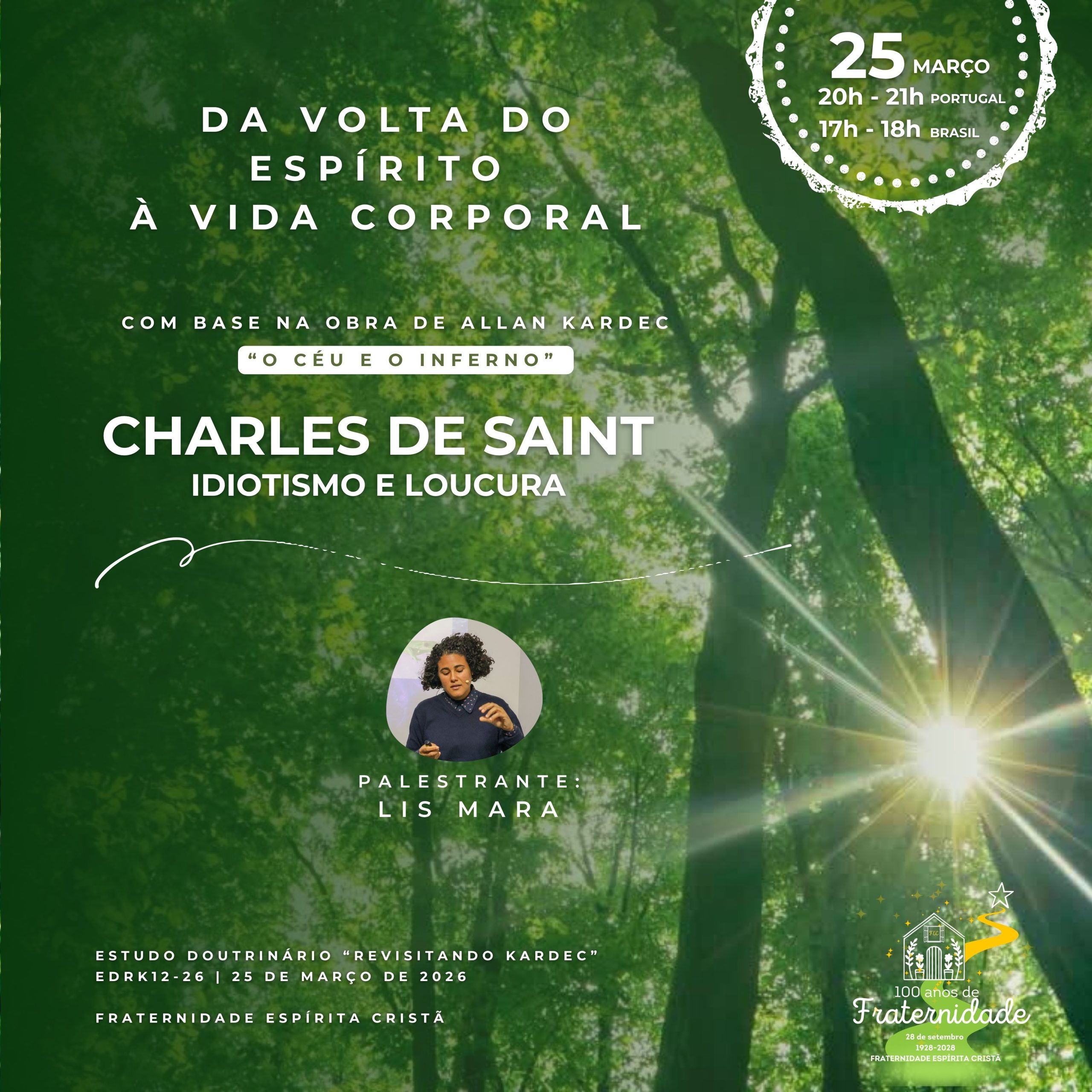 DESDE 1928 a estudar a doutrina espírita e a iluminar consciências inscreva-se 95.º Aniversário da FEC Estudo Doutrinário 2025/2026 Ciclo de Palestras "Revisitando Kardec" Dia 25 de março, 4.ª feira, 20h às 21h (horário de Portugal) | 17h às 18h (horário de Brasil) Pode assistir presencialmente na FEC ou através do nosso canal de Youtube e página de Facebook Contamos com a sua presença! Assista à palestra aqui! 95.º Aniversário da FEC Fraternidade Espírita Cristã (FEC) O que é a FEC Um Centro Espírita Espaço de estudo e divulgação da Doutrina Espírita Promoção de programas de estudo, palestras, seminários, workshops e conferências Publicação trimestral do boletim A Libertação Serviços de assistência espiritual A FEC desenvolve igualmente atividades de auxílio ao próximo através da ação social, em parceria com a Associação Auxílio e Amizade, uma Instituição Particular de Solidariedade Social que assiste famílias materialmente desfavorecidas na zona de Lisboa. (auxilioeamizade.pt) O que fazemos Atividades Atendimento Fraterno É uma forma de auxílio personalizado, com alguém disponível para ouvir, confortar e esclarecer de acordo com a Doutrina Espírita. Estudos São propostas de estudo em grupo (turmas) de temas que conduzem à reflexão sobre a importância da melhoria moral. Palestras Palestras de estudo doutrinário realizadas por diferentes expositores, sobre temas da atualidade. Auxílio Espiritual A FEC conta com um conjunto de serviços de auxílio, que contribuem para o auxílio físico e espiritual. Estudos Espíritas Têm como objetivo favorecer o desenvolvimento da consciência espírita, necessário ao aprimoramento moral do ser humano. AdultosCrianças e juventudeAdultos Aperfeiçoar o conhecimento do Espiritismo, por meio de estudos, leituras, pesquisas, análises, correlações e reflexões de assuntos existentes nas obras espíritas de referência. Crianças e juventude A atividade de Evangelização Espírita Infanto Juvenil, abrange as aulas de evangelização espírita, momento especial de convivência, aprendizado, reflexão, partilha de experiências e construção de vínculos de amizade e de fraternidade entre crianças e os jovens, sempre pautado pela vivência do Evangelho de Jesus. Passe Realizado pelos Benfeitores Espirituais, através da imposição das mãos dos médiuns, contribuindo para o equilíbrio físico e espiritual. Pronto Socorro Espiritual Para registar nomes de pessoas que sabemos necessitarem de auxílio mas que não frequentam o Centro Espírita. Ambulatório Espiritual Reforço magnético para problemas de natureza física. Fichas de Irradiação Forma de auxílio espiritual à distância, através do registo de nomes, em papel ou online, de pessoas encarnadas ou desencarnadas. (Enviar Aqui) SOS Espiritual Mensagem de consolo para auxílio espiritual à distância, disponível em fec.pt ou pelo telefone 218 873 794 Editorial Ler mais O nosso Boletim A Libertação A Libertação 169 “Inteligência suprema e causa primária de todas as coisas, energia criadora que preenche todos os espaços (…), permanece ainda, para a humanidade terrena, como o “desconhecido dos mil nomes”. No entanto, a intimidade que temos com Ele permite-nos estabelecer uma comunicação rápida e fácil. De imediato, sabe de nós, das nossas emoções, daquilo que nos move a cada momento porque, sendo uma presença constante em toda a parte, nada do que somos Lhe escapa ou Lhe é indiferente.(…)” A Libertação 168 A necessidade de Redenção agiganta-se e será alcançada pelo esforço próprio e com a presença da Perseverança, a amiga de todos os dias, porque nada é passível de maior recuperação do que a alma humana, mas sem constância a luta por essa vitória esmorece. Que este seja um Feliz Natal de 2025, sempre com Jesus! A Libertação 167 A Doutrina Espírita ensina-nos a identificar a estesia da vida, a captar a beleza da existência através da sensibilidade, a qual se apura no ser humano no decorrer das múltiplas existências e por meio do aprendizado que vai despertando a sua atenção para delicadezas que anteriormente nem sequer identificava. A Libertação 166 Suprema, e quem sabe derradeira, conquista da Humanidade, a capacidade de amar pela satisfação de o fazer sem nunca sentir falta de retorno, sem precisar de troca de afeto para continuar a amar, repõe continuamente aquilo que doa, sem que jamais chegue aquele instante sombrio em que a si mesma a alma se interroga se vale a pena continuar a gostar, a amar, se nem compreensão se recebe de volta, para já não dizer igual dose do afeto que se doou. O Nosso Trabalho Atual AllFEC All FEC Janeiro 17, 2026 Janeiro 17, 2026 Janeiro 17, 2026 Setembro 28, 2025 Setembro 19, 2025 Julho 5, 2024 Agosto 6, 2022 Agosto 1, 2022 Agosto 1, 2022 Agosto 1, 2022 Telefone: 218 821 043 (chamada para rede fixa nacional) Telemóvel: 913 313 766 (chamada para rede móvel) Email: correio@fec.pt Contacte-nos A carregar…