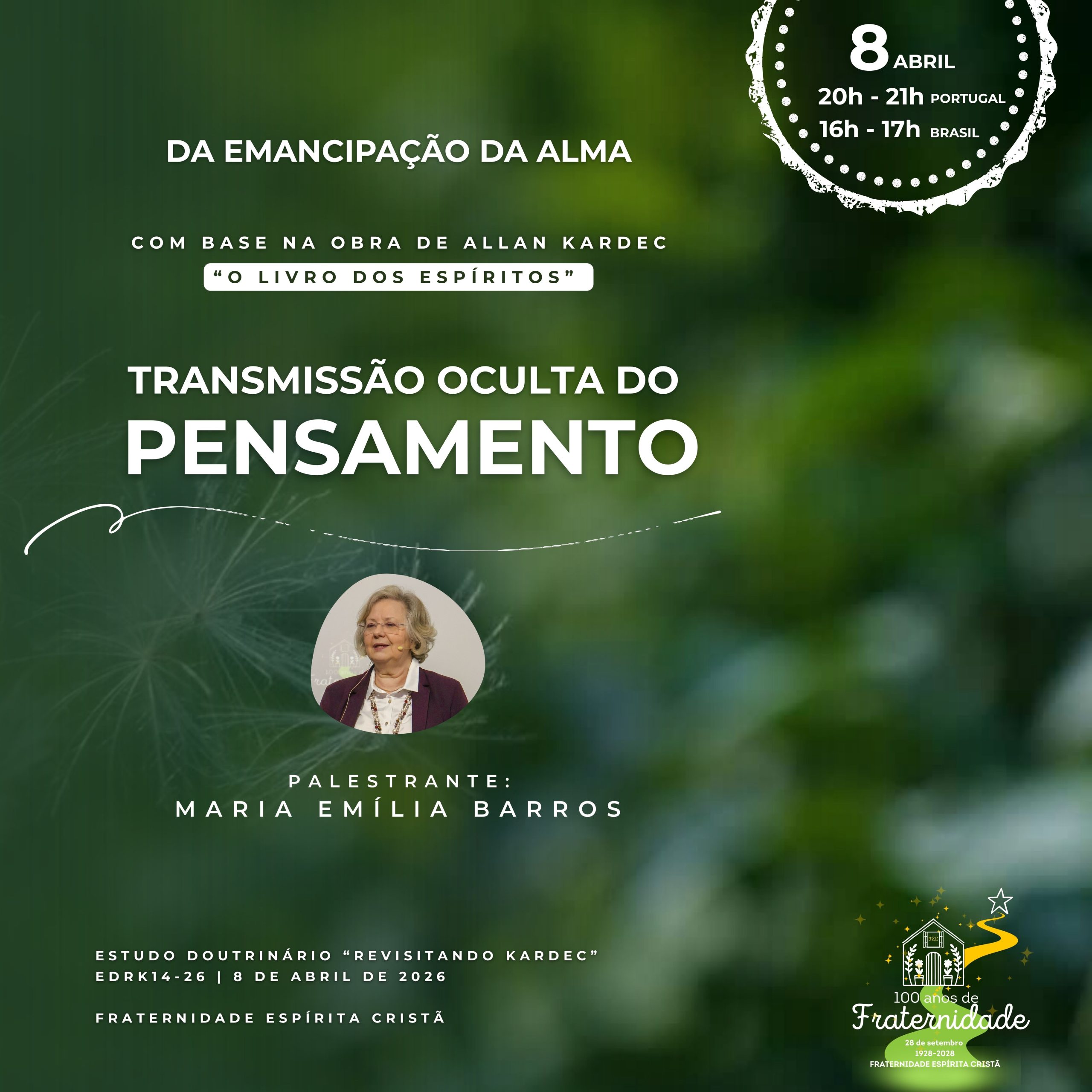 DESDE 1928 a estudar a doutrina espírita e a iluminar consciências inscreva-se 95.º Aniversário da FEC Estudo Doutrinário 2025/2026 Ciclo de Palestras "Revisitando Kardec" Dia 8 de abril, 4.ª feira, 20h às 21h (horário de Portugal) | 16h às 17h (horário de Brasil) Pode assistir presencialmente na FEC ou através do nosso canal de Youtube e página de Facebook Contamos com a sua presença! Assista à palestra aqui! 95.º Aniversário da FEC Fraternidade Espírita Cristã (FEC) O que é a FEC Um Centro Espírita Espaço de estudo e divulgação da Doutrina Espírita Promoção de programas de estudo, palestras, seminários, workshops e conferências Publicação trimestral do boletim A Libertação Serviços de assistência espiritual A FEC desenvolve igualmente atividades de auxílio ao próximo através da ação social, em parceria com a Associação Auxílio e Amizade, uma Instituição Particular de Solidariedade Social que assiste famílias materialmente desfavorecidas na zona de Lisboa. (auxilioeamizade.pt) O que fazemos Atividades Atendimento Fraterno É uma forma de auxílio personalizado, com alguém disponível para ouvir, confortar e esclarecer de acordo com a Doutrina Espírita. Estudos São propostas de estudo em grupo (turmas) de temas que conduzem à reflexão sobre a importância da melhoria moral. Palestras Palestras de estudo doutrinário realizadas por diferentes expositores, sobre temas da atualidade. Auxílio Espiritual A FEC conta com um conjunto de serviços de auxílio, que contribuem para o auxílio físico e espiritual. Estudos Espíritas Têm como objetivo favorecer o desenvolvimento da consciência espírita, necessário ao aprimoramento moral do ser humano. AdultosCrianças e juventudeAdultos Aperfeiçoar o conhecimento do Espiritismo, por meio de estudos, leituras, pesquisas, análises, correlações e reflexões de assuntos existentes nas obras espíritas de referência. Crianças e juventude A atividade de Evangelização Espírita Infanto Juvenil, abrange as aulas de evangelização espírita, momento especial de convivência, aprendizado, reflexão, partilha de experiências e construção de vínculos de amizade e de fraternidade entre crianças e os jovens, sempre pautado pela vivência do Evangelho de Jesus. Passe Realizado pelos Benfeitores Espirituais, através da imposição das mãos dos médiuns, contribuindo para o equilíbrio físico e espiritual. Pronto Socorro Espiritual Para registar nomes de pessoas que sabemos necessitarem de auxílio mas que não frequentam o Centro Espírita. Ambulatório Espiritual Reforço magnético para problemas de natureza física. Fichas de Irradiação Forma de auxílio espiritual à distância, através do registo de nomes, em papel ou online, de pessoas encarnadas ou desencarnadas. (Enviar Aqui) SOS Espiritual Mensagem de consolo para auxílio espiritual à distância, disponível em fec.pt ou pelo telefone 218 873 794 Editorial Ler mais O nosso Boletim A Libertação A Libertação 169 “Inteligência suprema e causa primária de todas as coisas, energia criadora que preenche todos os espaços (…), permanece ainda, para a humanidade terrena, como o “desconhecido dos mil nomes”. No entanto, a intimidade que temos com Ele permite-nos estabelecer uma comunicação rápida e fácil. De imediato, sabe de nós, das nossas emoções, daquilo que nos move a cada momento porque, sendo uma presença constante em toda a parte, nada do que somos Lhe escapa ou Lhe é indiferente.(…)” A Libertação 168 A necessidade de Redenção agiganta-se e será alcançada pelo esforço próprio e com a presença da Perseverança, a amiga de todos os dias, porque nada é passível de maior recuperação do que a alma humana, mas sem constância a luta por essa vitória esmorece. Que este seja um Feliz Natal de 2025, sempre com Jesus! A Libertação 167 A Doutrina Espírita ensina-nos a identificar a estesia da vida, a captar a beleza da existência através da sensibilidade, a qual se apura no ser humano no decorrer das múltiplas existências e por meio do aprendizado que vai despertando a sua atenção para delicadezas que anteriormente nem sequer identificava. A Libertação 166 Suprema, e quem sabe derradeira, conquista da Humanidade, a capacidade de amar pela satisfação de o fazer sem nunca sentir falta de retorno, sem precisar de troca de afeto para continuar a amar, repõe continuamente aquilo que doa, sem que jamais chegue aquele instante sombrio em que a si mesma a alma se interroga se vale a pena continuar a gostar, a amar, se nem compreensão se recebe de volta, para já não dizer igual dose do afeto que se doou. O Nosso Trabalho Atual AllFEC All FEC Março 30, 2026 Março 30, 2026 Janeiro 17, 2026 Setembro 28, 2025 Setembro 19, 2025 Julho 5, 2024 Agosto 6, 2022 Agosto 1, 2022 Agosto 1, 2022 Agosto 1, 2022 Telefone: 218 821 043 (chamada para rede fixa nacional) Telemóvel: 913 313 766 (chamada para rede móvel) Email: correio@fec.pt Contacte-nos A carregar…